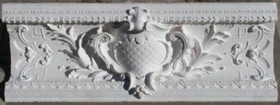 Ornamentales Eckgesims, Voute mit verzierter Profilierung, Wappenkartusche und floralen Ornamenten.
