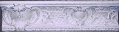 Ornamentales Eckgesims, Voute mit verzierter Profilierung, große und kleine Wappenkartusche, floralen Ornamenten und Gittermuster.